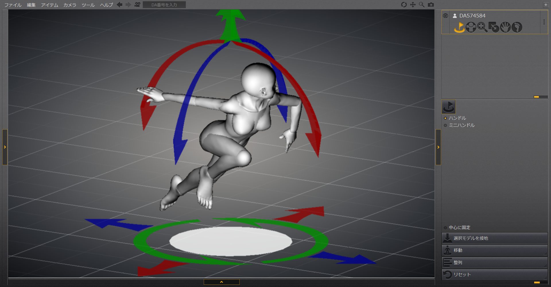 4.ドールをその場で回転させるのに使うのは、足もとの白い円のまわりに表示されている緑色の矢印です。